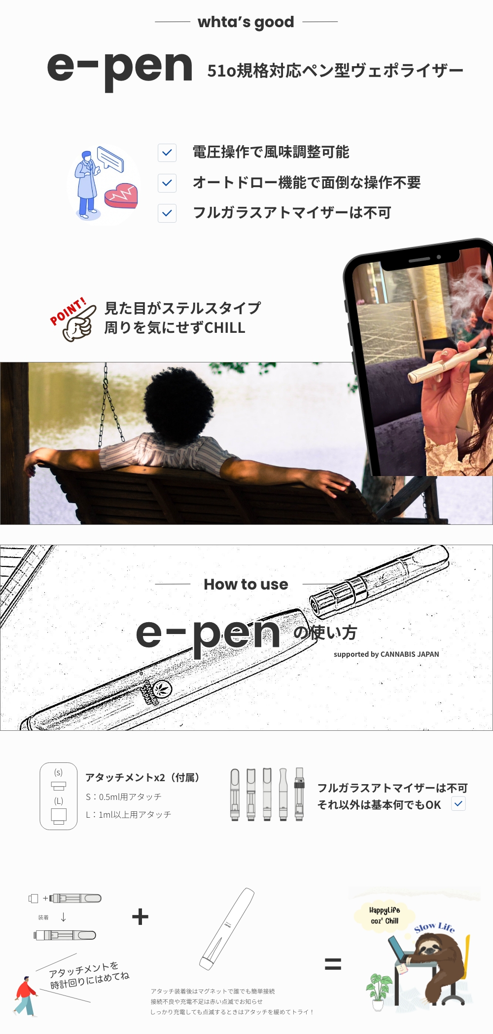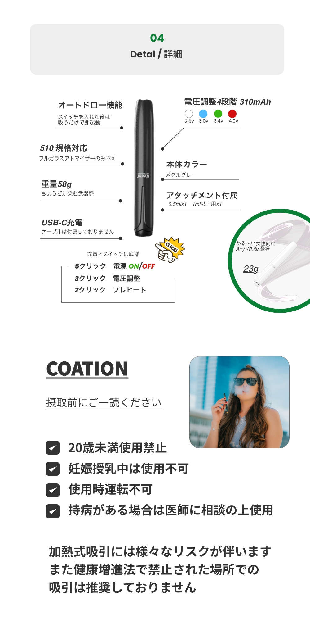 ・バッテリー:310mAh(本体底部を5クリックでON/OFF)