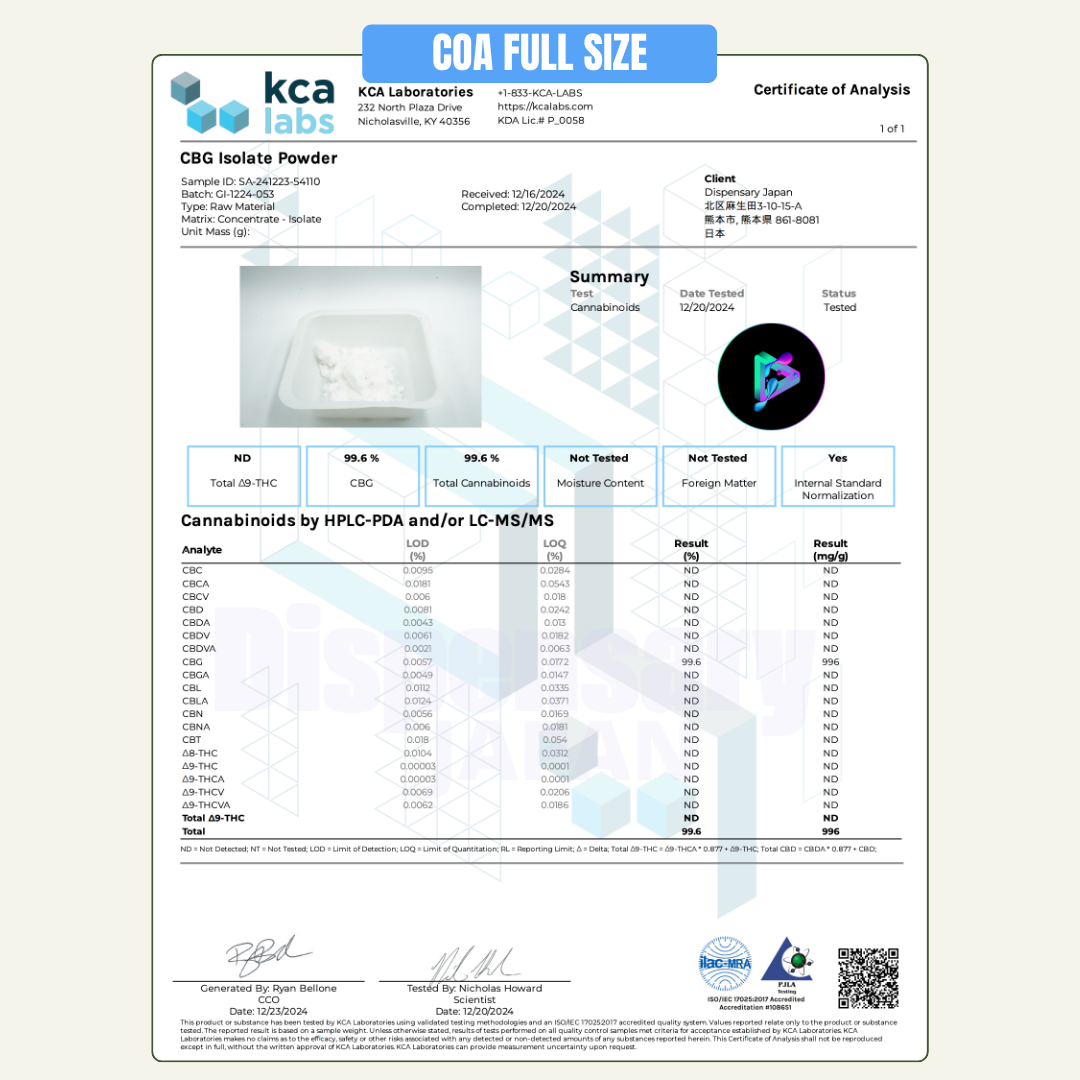 THCを1ppmレベルまで抑え、純度99.3%を実現した高品質CBGパウダー