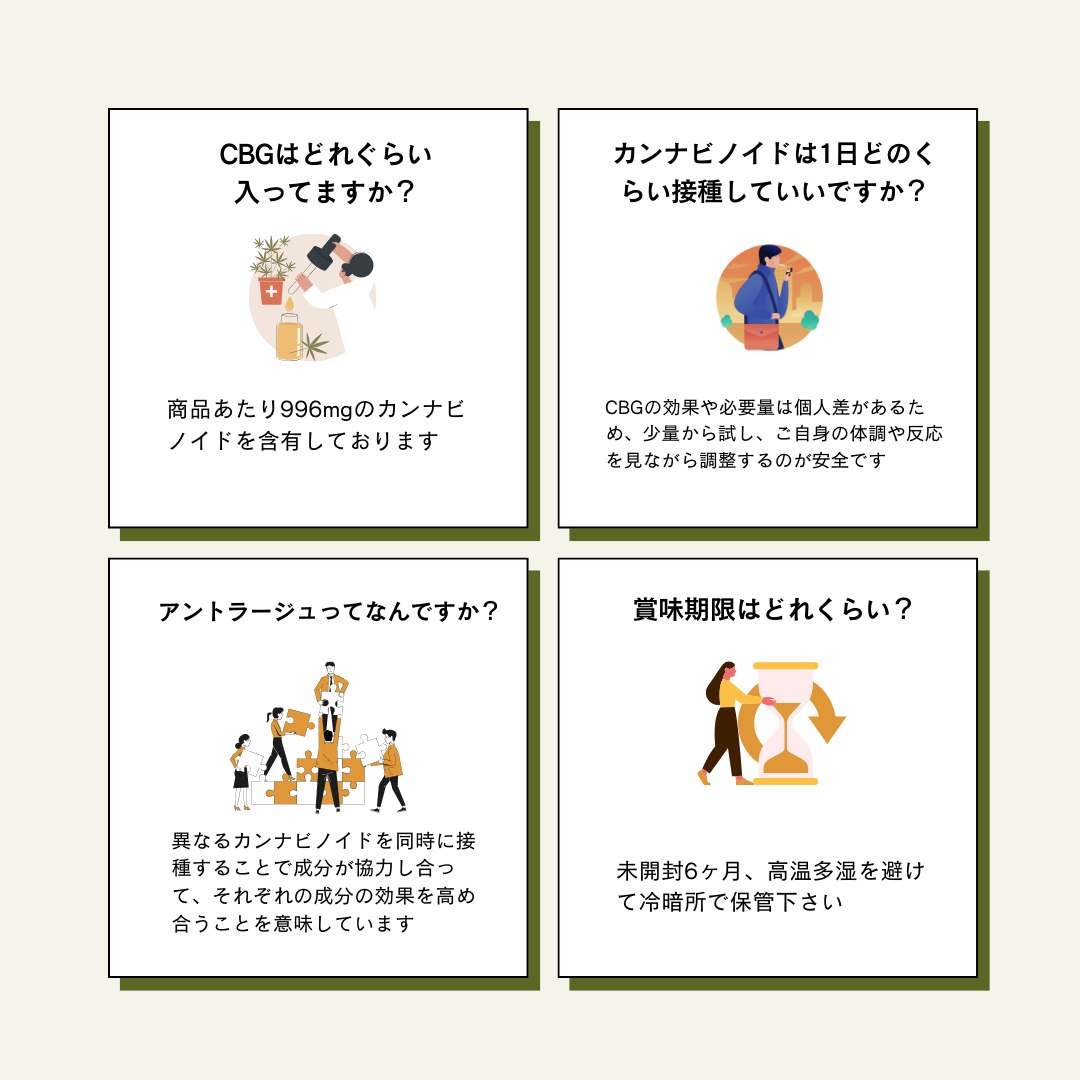 - カンナビノイドは自然の植物から作られ、個人差が大きいため、適切な量は人によって異なります。少量から始めて、自身の目的に合った適量を見つけ出すことを推奨します。