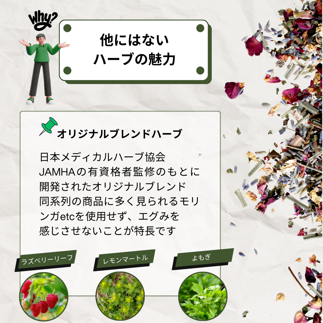 このハーブブレンドは、ラズベリーリーフ、レモンマートル、ヨモギなどを組み合わせて作られており、テルペンやフラボノイドの効能を高めるために独自の製法が用いられています。