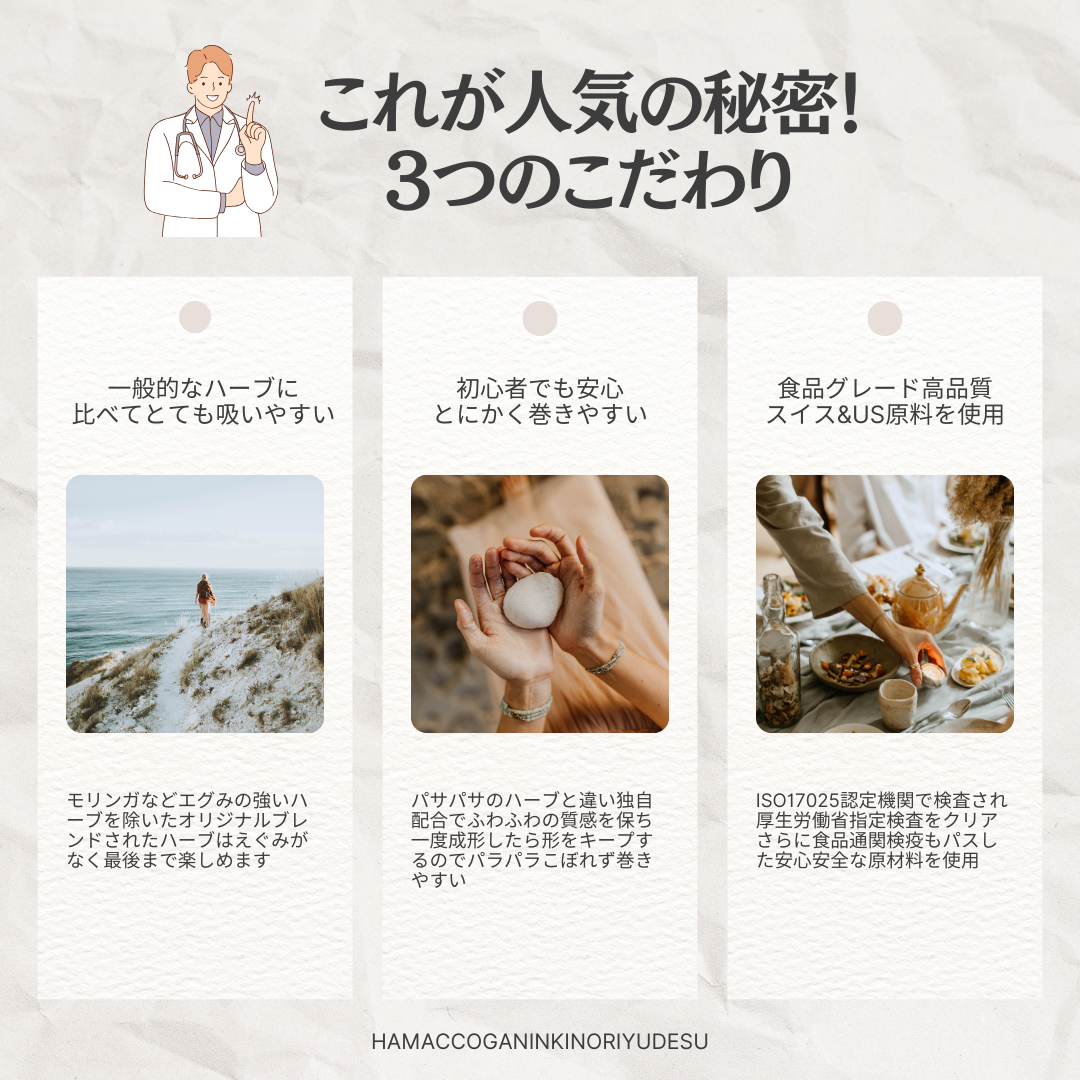 特に注目すべきは、モリンガやマシュマロ、マレインなどを使用した他のハーブと比較して形が崩れにくく、手巻きの楽しさを存分に味わえます。さらに、カンナビノイド吸収率が高く、効果の体感が早いという点も魅力的です。大量生産ではなく、少量ずつ丁寧に撹拌し均一化を図ることで品質を保っています。他社の製品と比較して、味や喉への負担が少なく、一本吸えるような仕上がりになっているため、「2本目を吸いたくなる」ような体験を提供します。